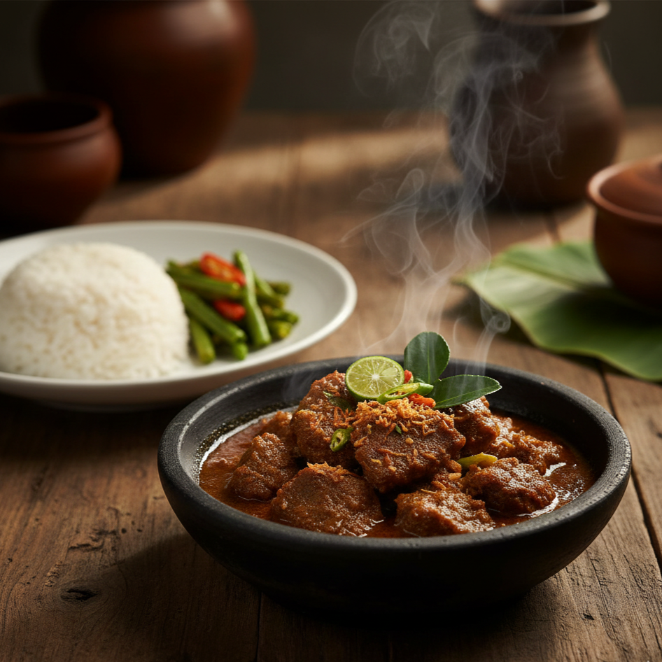 Berikut adalah deskripsi singkat mengenai rendang: Rendang adalah mahakarya kuliner Minangkabau berupa olahan daging yang dimasak perlahan dengan santan dan rempah kaya bumbu hingga kering dan berwarna cokelat gelap. Dikenal sebagai salah satu makanan terlezat di dunia, hidangan ini melambangkan kesabaran, ketelitian, dan kearifan budaya masyarakat Sumatra Barat.
